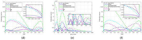 Figure 5a,c,e, the result is successively the GEV, WW, and Weibull distributions in descending order of GOF. The second echelon is the Log-normal distribution, and the third echelon is the K and KK distributions. And as expected, the GP distribution is the worst. A similar result is evident in