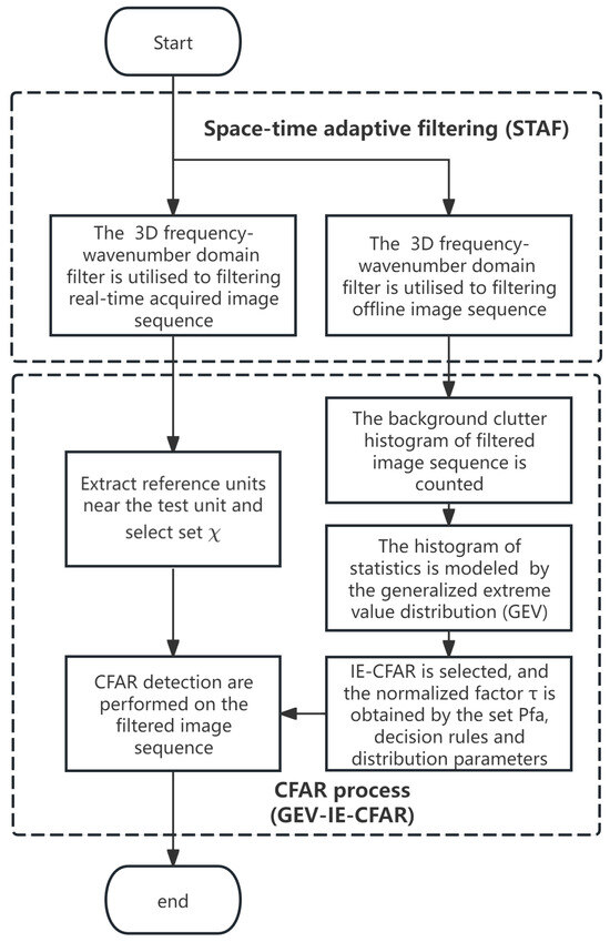 Due to the fact that the detection link in the proposed STAF-RCBD-CFAR is not a CFAR detector under clutter modeling, but a global threshold CFAR detector, its detection performance for low SCR target edge points is not satisfactory. In order to address this issue, this paper first improves the original two-stage detection STAF-RCBD-CFAR method by designing a CFAR detector under clutter backgrounds based on filtered imagery. The design process encompasses two key components: the first component involves conducting a statistical analysis of the clutter background subsequent to STAF filtering, while the second component pertains to selecting the optimal detector tailored to the distribution of the clutter background post-STAF filtering. The statistical analysis of radar clutter backgrounds under varying conditions, utilizing known distributions, has been one of the research topics continuously pursued in recent decades. This article presented a statistical analysis of background clutter filtered by STAF, employing Log-normal, Weibull, K, Generalized Pareto, KK, WW distributions, and GEV distributions. Due to the absence of sea clutter, the conventional sea clutter model proves to be inapplicable. The introduced GEV distribution demonstrates superior fit due to its characteristic of containing a small amount of extreme clutter in a large number of uniform clutters. Although GEV has previously been utilized in SAR radar’s sea clutter distribution fitting, it is important to note that the imaging mechanisms between SAR and maritime radars are fundamentally different. Meanwhile, the existing literature predominantly employs GEV theory for fitting sea clutter peaks or distributions under specific conditions (such as non-uniform or uniform multi-target scenarios), rather than focusing on global clutter distribution fitting that effectively filters out sea clutter. Regarding the research on the second aspect, evaluating the detection performance of known detectors under different distributions remains a key research topic. To date, there has been no investigation into the detection performance of these CRP-CFAR methods under the GEV distribution. This paper employed multiple background clutter datasets characterized by the GEV distribution to evaluate and analyze the performance of various detectors, ultimately identifying the optimal detector within the STAF-GEV distribution model. The innovative contributions of this paper can be summarized as follows.