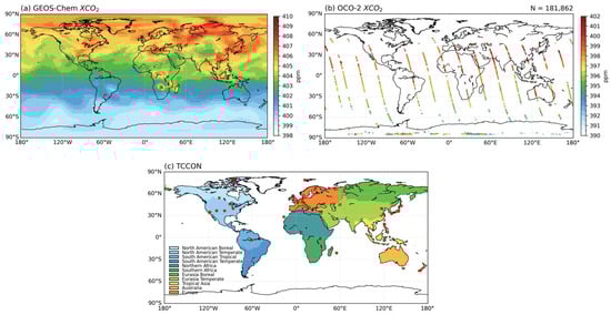 The Total Carbon Column Observing Network (TCCON) retrieves XCO2 based on near-infrared spectral records from ground-based Fourier Transform Spectrometers. The TCCON consists of 30 ground-based CO2 measurement stations located across various continents (Figure 1c). Due to the high precision of atmospheric CO2 monitoring, TCCON data are widely used to validate satellite-derived and reconstructed CO2 products [,,].