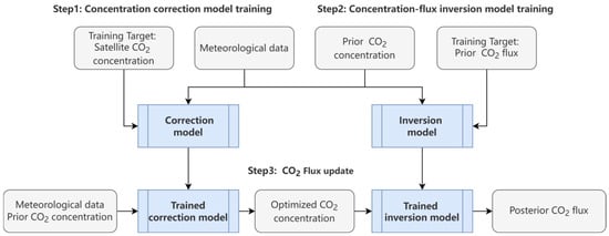 Step 3: Updating the CO2 flux. Once the well-trained CO2 concentration correction model and concentration–flux inversion model were obtained, the 3-hour-averaged CO2 concentration and meteorological data were input into the well-trained CO2 concentration correction model to generate the optimized global CO2 concentration. These optimized global CO2 concentrations, along with the meteorological data, were then input into the well-trained concentration–flux inversion model to generate the posterior CO2 flux.