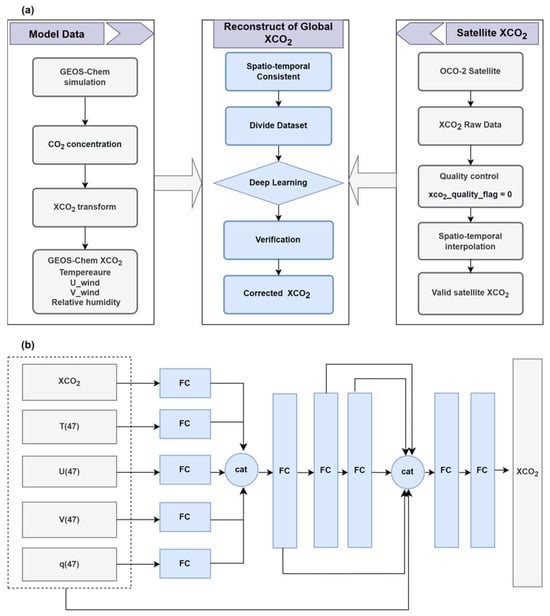 Figure 3 shows the structure for establishing the CO2 concentration correction model, which is based on simulated data from GEOS-Chem and observed CO2 concentrations from OCO-2 (Figure 3a). For satellite observations, quality control and spatio-temporal interpolation are performed as described in Section 2.1.2. For GEOS-Chem data, the XCO2 is obtained as described in Section 2.1.1, and all simulation data are resampled to match the locations of satellite observations. This ensures a consistent dataset in both space and time for observed and simulated data. It should be noted that the calculation of GEOS-Chem XCO2 and OCO-2 XCO2 is somewhat different because XCO2 retrieved from OCO-2 requires both the satellite column averaging kernel and the a priori profile []. However, this algorithmic bias will also be corrected in this CO2 correction model. The dataset from 2015 to 2017 was used for model training, the 2018 dataset was used for model validation, and the 2019 dataset was used for testing. Consequently, the training dataset consists of 438,458 grid points, while the validation and test datasets consist of 167,316, and 162,530 grid points, respectively.