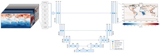 In our concentration–flux inversion model based on the U-Net neural network, the output layer represents the CO2 flux with dimensions of 91 by 144. The size of the input image is (91, 144, 64); thus, the input layer consists of 64 features. These features consist of 15 levels each of temperature profiles, humidity profiles, and meridional and zonal wind profiles, one level of boundary layer height, one level of shortwave radiation, and two time steps (current and next time steps) of CO2 concentration. Note that the change in CO2 concentration is determined by fluxes and other meteorological fields, so the current and next time steps of CO2 concentration are a good indication of the value of CO2 fluxes. Meanwhile, we selected 15 out of the 47 layers of meteorological profile features for model training to increase the efficiency and reduce the computational resources. The difference in current and next time steps of CO2 concentration and all layers of meteorological profile features were used to train the model, and the model showed similar performance. The U-Net model was trained on data from 2015 to 2017, with 2018 data serving as the validation set. Data from 2019 were used as the test dataset to validate the performance of the concentration–flux inversion model. Thus, the length of the training, validation, and test sets is 8768, 2920, and 2920, respectively.