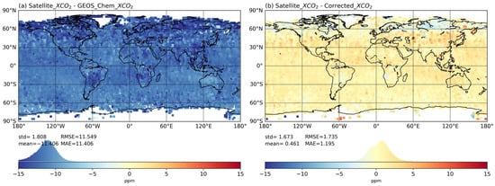 The validation performance of the concentration correction model. The distribution of (a) differences between satellite-observed and GEOS-Chem-simulated CO2 concentration, and (b) differences between satellite-observed and model-predicted CO2 concentration are shown.