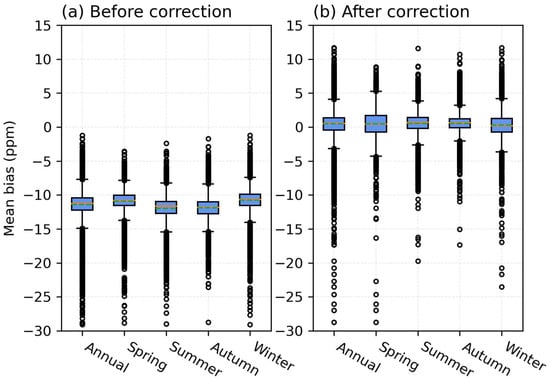 Performance of the concentration correction model for each season. Boxplots show the mean bias of the valid grid in annual, spring, summer, autumn, and winter (a) before correction and (b) after correction.