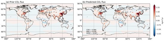 The validation performance of the concentration–flux inversion model. Shown are the annual mean of (a) prior CO2 flux and (b) predicted CO2 flux by concentration-flux inversion model.