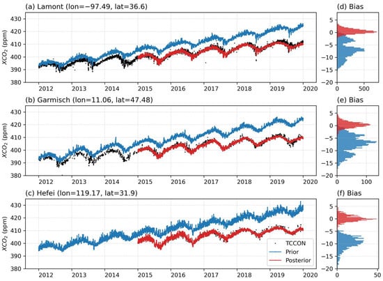 Comparisons between corrected posterior CO2 concentration and three TCCON retrievals. Left panels show the time series of prior (blue), posterior (red), and observed XCO2 (black) for (a) Lamont station in the Americas, (b) Garmisch station in Europe, and (c) Hefei station in Asia. The right panels show the corresponding probability distribution of the bias between observation and prior XCO2 (blue), and the bias between observation and posterior XCO2 (red) for (d) Lamont, (e) Garmisch, and (f) Hefei, respectively.