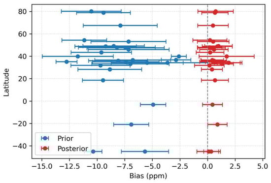 Additionally, Figure 9 presents a comparison of CO2 concentrations for each TCCON site across different latitudes. The bias values of the prior CO2 concentration are quite large, with a global mean of −7.87 ppm. In contrast, the bias values of the posterior CO2 concentration at most sites are reduced to within 1 ppm, with a global mean of 0.68 ppm. These results confirmed the reliability of the corrected posterior CO2 concentration data.