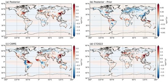 In addition, our posterior CO2 flux was compared with the estimations from CAMS and CT2022. It is important to note that there are systematic differences in the CO2 flux obtained from different inversions between CAMS and CT2022 (Figure 10c,d), which may be due to the different observations and prior fluxes used. Previous studies found that the different choices of terrestrial CO2 fluxes [], emission inventories [], and whether ground-based or satellite observations are assimilated [], can all lead to varying flux distributions in the inversion.