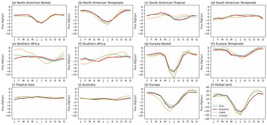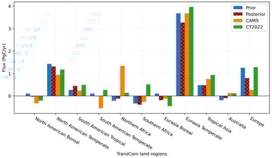 Overall, the distribution of our posterior CO2 flux was broadly consistent with that of CT2022 (Figure 10a,d). Furthermore, we estimated the carbon flux over the 11 TransCom land regions (Figure 11). The results indicate that large carbon sources are located in the Eurasia Temperate, North American Temperate, and Tropical Asia regions due to anthropogenic carbon emissions. Compared to prior flux, these large carbon sources have been reduced in our posterior estimation. There is minimal difference between the prior and posterior estimations of CO2 flux in Tropical Asia. However, it is important to highlight that the carbon source is augmented in the maritime continental region, while there is a significant decrease in China (Figure 10b). CAMS shows a large carbon source in Northern Africa and a large sink in South American Temperate, which is not displayed in our inversion and CT2022.