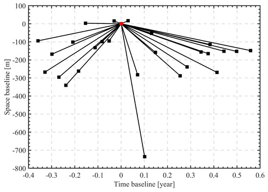 Spatial–Temporal baseline distribution of the SAR images. The highlighted red circle represents the master image.