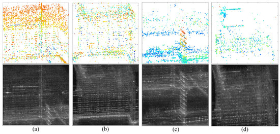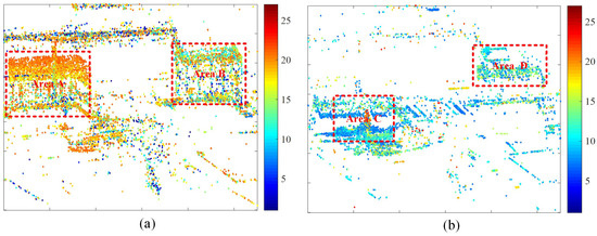 Figure 11a ,b represents the estimated height point cloud map of APCSs and DPCSs, respectively. It can be observed that the proposed PCS height inversion method effectively retrieves height information for most buildings within the distribution of PCSs. Figure 12a demonstrates a successful inversion of height information for newly constructed buildings within the temporal baseline, as exemplified by two twin-tower structures shown in the optical image of Figure 5. The observed vertical upward trend in point cloud heights confirms the accuracy of the inversion results for APCS points, aligning with real-world observations. Figure 12b primarily displays the height map of disappeared, occluded, and covered targets within the temporal baseline. This includes the successful inversion of heights for occluded exterior walls in Area C and covered rectangular buildings in Area D. Compared with the step change position map in Figure 7, the height maps of APCS and DPCS points offer a more intuitive means to analyze the building information in the changing area.
