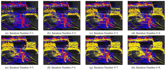 To better demonstrate the effectiveness of the proposed method, Figure 11 illustrates the iterative generation process of the APCS sub-network shown in Figure 10a. Figure 11a displays the first-level sub-network connected to the PS RN, where there are newly added PS–APCS edges. Due to the clustered distribution of PS and APCS points across different regions, PS–APCS edges are formed only between some boundary points in some overlapping areas, resulting in a limited number of high-quality connections. Figure 11b–h show high-quality APCS–APCS edges identified in each iteration. As iterations progress, the sub-networks increasingly cover most buildings around APCS points. Table 3 records the size of each iteratively generated sub-network and the proportion of connected APCSs relative to the total number. The results reveal that as iterations increase, the number of APCSs in the new sub-network decreases. After five iterations, the network coverage of newly generated sub-networks drops below 5%, limiting the distribution of newly connected APCSs. Beyond eight iterations, the overall network coverage gain from finding new APCS points is around 1%. The set of scaling factor can reduce time complexity in large-scale scene processing. This novel network generation method improves the APCS coverage by 3.11 times compared with the strategy of traditional two-tier network using only PSs as references, effectively enabling elevation inversion for more APCSs.