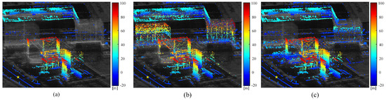 Figure 13 compares the height point cloud of PSa obtained by traditional SAR tomography methods with the joint height point cloud with PCSs using the proposed method. Figure 13b includes 16,512 PSs and 8845 APCSs, while Figure 13c includes 16,512 PSs and 5042 DPCSs. The height distribution of PCSs in adjacent regions is consistent with PSs, with no significant change in the overall height range. Compared with Figure 13a, which displays only PSs, the unified height point cloud map aligns more closely with the distribution of strong scatterers in the SAR average amplitude image. As APCSs are designed to describe targets that maintain interferometric stability until the final time baseline, their height results provide a supplement of existing building and man-made structure heights. Additionally, the use of DPCSs facilitates the extraction of historical height information, aiding in the reconstruction of obscured areas.