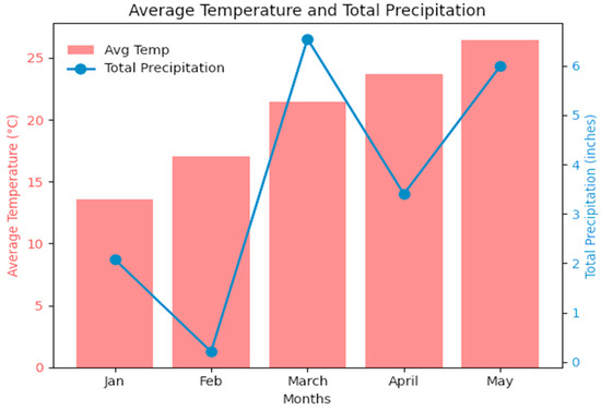 The study was conducted in 2016 at the Texas A&M AgriLife Research and Extension Center in Nueces County, Texas, on the border of the Gulf Coast and coastal saline prairies (at an elevation of approximately 16 m) (Figure 1). The region is humid subtropical (Cfa)—receiving, on average, 34–38 inches of rainfall annually (NOAA)—with soil composition consisting primarily of Victoria (VcA) clay (43.8%), with Orelia (Of) fine sandy loam (4.7%), Raymondville (CcA) complex (4.5%), and Galveston/Mustang (Gm) fine sands (3%) also being notable components (USDA-NRCS). The experiment was carried out on a field containing a wheat mapping population consisting of 180 recombinant inbred lines (RILS) developed from a cross between the heat-tolerant ‘Halberd’ and the moderately heat-susceptible ‘Len’ cultivars, planted in two replications across an alpha lattice layout, creating a total of 364 individual plots. Figure 2 illustrates the climatic conditions at the study site, highlighting a pattern of progressively increasing precipitation throughout the growing period.
