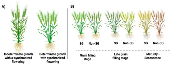 Flowering synchrony is a crucial trait for yield optimization and efficient harvesting. Flowering synchronization is regulated by three major genetics systems in wheat—vernalization, photoperiodism, and earliness offer wheat’s genetic potential to be fine-tuned by their exploitation [33]. Moreover, this flowering uniformity is particularly important under abiotic stress conditions where crops mature during increasing temperatures following an avoidance mechanism [34]. This strategy helps plants maximize yield by preventing the detrimental effects of frost and heat on reproductive developmental stages. Genetic studies have shown that earlier headings and delayed physiological maturity with prolonged grain-filling periods (SG traits) result in higher grain protein content, while overall grain yield can vary depending on environmental conditions [35]. Flowering synchrony and an extended grain-filling period could be important selection targets in crop breeding programs for improving grain yield and quality.