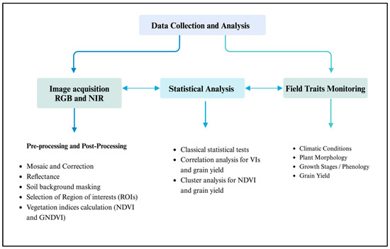 High-throughput remote sensing, employing platforms such as unmanned aerial vehicles (UAVs) and satellite imagery, has become increasingly adopted for a wide range of vegetation-related applications, including the study of crop phenology, analysis of biophysical characteristics, and non-destructive examination of root systems and their connection to the surrounding environment [4,5]. One of the most popular tools, LiDAR (light detection and ranging), facilitates the laser scanning of trees and crop plants to create highly accurate 3D structural models [6]. This advanced technology swiftly assesses the above-ground plant structure, revealing crucial information such as plant height and physiological arrangement, as well as metrics related to volume and density [7]. These parameters directly reflect various agronomic characteristics (particularly those related to crop yield and biomass), offering valuable insights into the interplay between light and vegetative resources, especially concerning plant tillering and branching patterns [8]. UAVs equipped with high temporal and spatial resolution multispectral or hyperspectral imaging capabilities can assess crop health and track growth stages throughout the entire growth period [9]. Similarly, the ground-penetrating radar (GPR) scanning system provides a non-destructive method for analyzing below-ground plant systems, offering measurements of root biomass, length, and density [10].