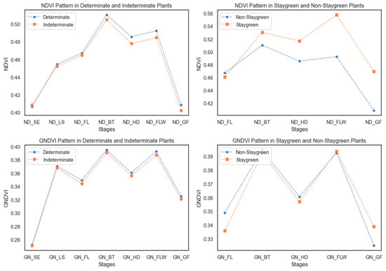 These variations likely reflect differences in growth dynamics, canopy structure, and physiological processes between determinate and indeterminate plants. A notable distinction was seen during the early- and late-stage clustering of NDVI and GNDVI for grain yield in both determinate and indeterminate categories (Figure 8). This finding suggests that these indices effectively capture the dynamics associated with senescence and canopy greenness during the critical phase of the plant’s life cycle.