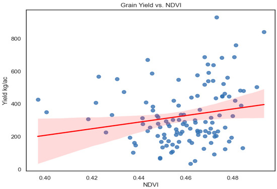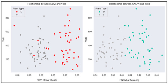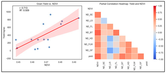 This study observed a positive correlation between overall NDVI and grain yield. However, no correlation was found between grain yield and NDVI during early growth stages. Notably, positive correlations emerged during the booting, heading, and grain-filling stages, emphasizing the dynamic nature of the relationship between NDVI and grain yield at different growth phases (Figure 12). The determinate group performed better for grain yield as compared to the indeterminate group. Further studies and an improved understanding of these plant groups’ specific traits and physiological mechanisms can provide additional insights into the observed variations in NDVI distribution.