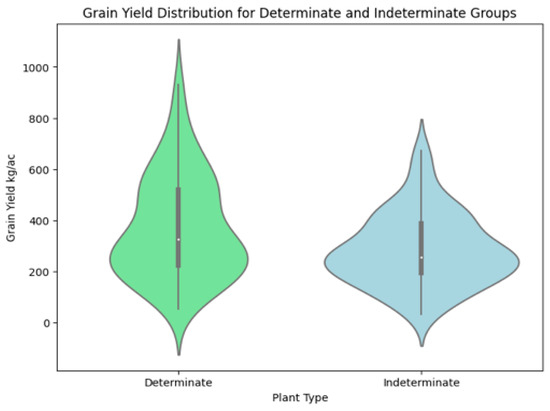 The violin plot (Figure 9) compares grain yield distributions between determinate and indeterminate plant types. The determinate group shows a wider spread and higher peak densities of around 400–600 kg/acre, suggesting a tendency for higher yields, with the median yield higher than that of the indeterminate group. In contrast, the indeterminate group has a more concentrated distribution, with values centered around 300–500 kg/acre, indicating lower overall yield. The interquartile ranges and medians further illustrate that determinate plants generally outperform indeterminate plants in grain yield.