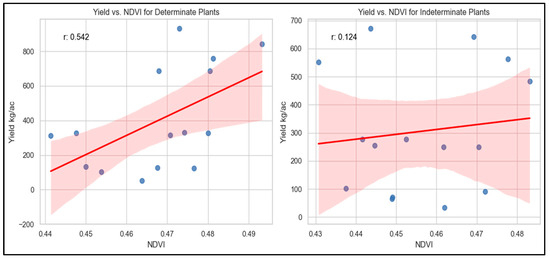 Correlation analysis within the subset for grain yield and NDVI in determinate (left) and indeterminate (right) groups.
