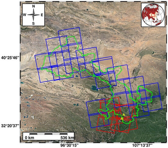 Coverage of Sentinel-1A data used in InSAR phase gradient landslide dataset and automatic landslide identification in Gansu Province. The yellow triangle in the figure represents the research area for the experiment discussed in Section 3. The green box outlines the entire Gansu Province, while the red box indicates the area of sentinel data relevant to the experimental region in Section 3. The blue box signifies the expanded area that includes sentinel data covering the entire Gansu Province.