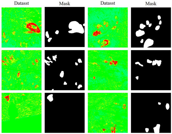 After visualizing the data and labels, we slice the visualized results. We crop the data into 512 × 512 sizes using a sliding window with a 128-pixel overlap. This approach prevents the issue of incomplete landslides caused by the partially cropping of some labels. Secondly, since landslides do not exist in the entire area, there will inevitably be redundant data after cropping with the sliding window. Retaining these data can affect the training process, so we remove the slices where the landslide area is less than 5%. Some samples and their corresponding labels are shown in Figure 4. In the labels, the white areas represent the landslides while the black areas represent the non-landslide regions. Through cropping and filtering, we have obtained a total of 709 samples. We use 102 data points from tracks 55~102 for final validation, leaving 607 samples for network training.
