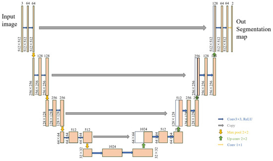 Semantic segmentation aims to classify each pixel in an image, achieving pixel-level precision and finding applications in facial detection, autonomous driving, medical image analysis, and more. Unlike traditional convolutional neural networks (CNNs) used for image classification, semantic segmentation assigns a label to every pixel in the image. Fully Convolutional Networks (FCNs) implement pixel-level segmentation using deconvolution for upsampling but are sensitive to training dataset size and network structure. U-Net, an advanced deep learning architecture, is a classic deep learning framework that was initially proposed by Ronneberger et al. in 2015 [25], and it is widely used for medical image segmentation tasks. U-Net employs a decoder structure corresponding to an encoder, as illustrated in Figure 5. The decoder part has a large number of feature channels and uses a skip connection strategy to concatenate the encoder features with the decoder features and pass them to high-resolution layers, allowing for the capture of more contextual information. The entire network exhibits a U-shaped structure, hence the name U-Net, which also makes it easier to segment large-scale images.