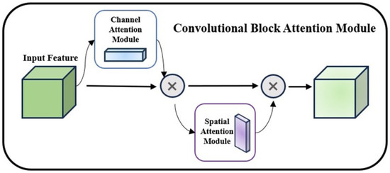 Attention mechanisms enhance neural networks by focusing on crucial parts of input data, mimicking human attention distribution. They primarily include spatial and channel attention mechanisms, which help the model more accurately assess the importance of input features. The Convolutional Block Attention Module (CBAM) integrates these two mechanisms, further improving model performance. CBAM strengthens feature representation through channel and spatial attention mechanisms, enabling the network to concentrate on key areas and increasing task accuracy. It also possesses adaptive adjustment capabilities to accommodate different data and tasks while maintaining low computational overhead, making it suitable for real-time applications and resource-constrained devices. CBAM excels in image classification, object detection, semantic segmentation, medical image analysis, and video analysis, effectively enhancing feature extraction accuracy and efficiency. The structure is shown in Figure 6.