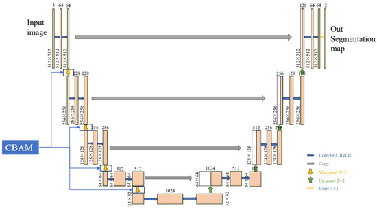 In this paper, we integrate the CBAM into the downsampling area of the U-Net architecture to enhance its feature extraction capabilities, as depicted in Figure 7. This modified U-Net, termed AttU-Net (Attention U-Net), leverages the strengths of both U-Net and CBAM. U-Net’s encoder–decoder structure excels in capturing multi-scale features and preserving spatial information while CBAM further refines feature representation by applying adaptive attention mechanisms. CBAM’s channel and spatial attention modules allow the AttU-Net to focus on the most informative features and regions, improving the network’s ability to differentiate between relevant and irrelevant information. This integration leads to more accurate feature extraction, better performance in segmentation tasks, and overall enhanced model robustness. The overall process of the proposed method is shown in Figure 8.