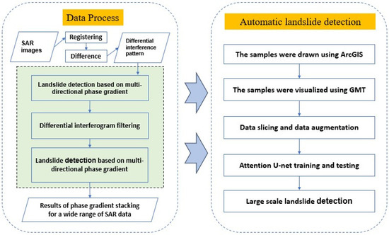 Amidst the thriving development of deep learning technologies, particularly the remarkable performance of Convolutional Neural Networks (CNNs) in optical remote sensing [15,16], we are keenly aware that integrating this cutting-edge technology with InSAR will revolutionize automatic landslide identification. The current research predominantly focuses on volcanoes and earthquakes [17,18,19,20,21,22,23], where detection performance hinges on the size of datasets, a resource-intensive requirement. Moreover, the peculiarities of InSAR landslide signatures, such as their concealment and irregular shapes, may hinder optimal performance when directly applying deep learning models. Nevertheless, our work boldly explores this frontier, fully acknowledging the uniqueness of landslide deformation signatures in InSAR differential interferograms. By leveraging phase gradient stacking to emphasize landslide deformation features and integrating these stacked images with a deep learning network, specifically our designed Attention U-Net (AttU-Net) network, we achieve the faster and more accurate intelligent identification of landslide deformation areas [24].