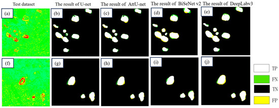 The test results of the four models in the multi-directional phase-gradient stacked dataset. (a,f) are the data samples in test dataset, (b,g) are the results of the U-net, (c,h) are the results of the AttU-net, (d,i) are the results of the BiSeNet v2, (e,j) are the results of the DeepLabv3.