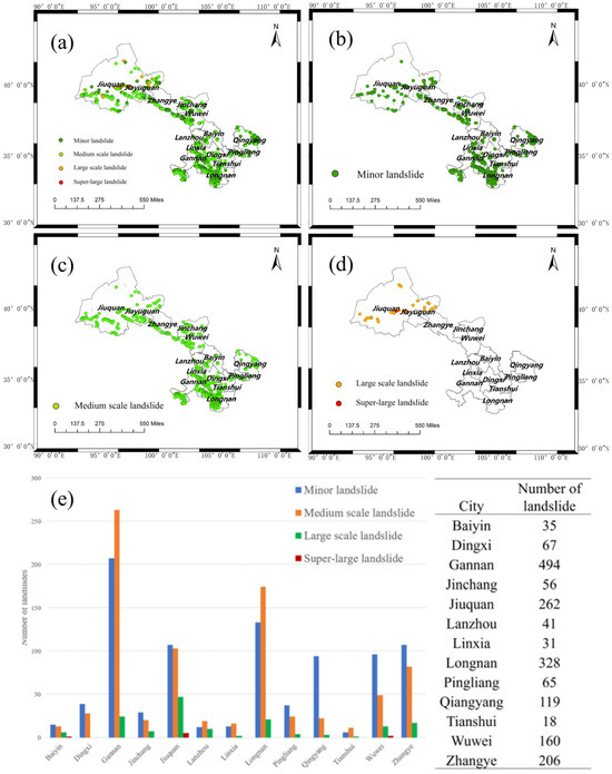 The landslide distribution results obtained by AttU-Net. (a) The overall distribution of all landslides across Gansu Province. (b) The distribution of micro-landslides within the same region. (c) The spatial distribution of medium-sized landslides. (d) The locations of large and very large landslides. (e) A summary of the numbers of landslides of different scales across the 13 cities in Gansu Province.