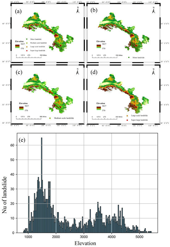 Landslide distribution and elevation analysis in Gansu Province. (a) Correlation between landslide distribution identified by the model and elevation data. (b) Distribution of micro-landslides within Gansu Province. (c) Distribution of medium-sized landslides. (d) Elevation locations for large and very large landslides. (e) Statistical analysis of the elevation distribution of the identified landslides.