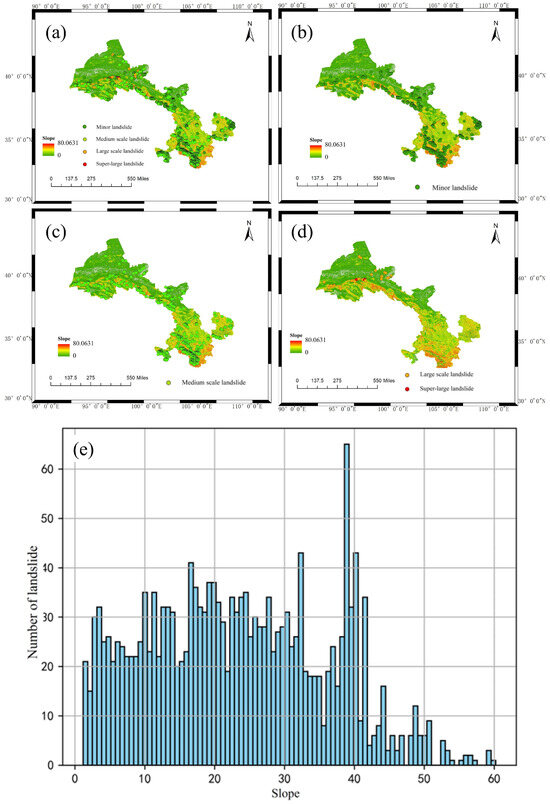 Slopes are a significant factor in the development of landslide hazards. When a slope is not steep, the probability of failure is minimal. Conversely, rocks and soil become unstable when a slope is very steep. This paper analyzed the slope information of the 1882 identified landslides as shown in Figure 13. Figure 13a presents the slope information for Gansu Province, highlighting that the southern part of the province has relatively steep slopes. In Figure 13b, we display the distribution of micro-landslides in Gansu Province. Figure 13c illustrates the distribution of medium-sized landslides. Finally, Figure 13d shows the spatial distribution of large and very large landslides. Additionally, the region along the eastern border with Qinghai Province also features steep slopes. The landslides identified by the model were primarily distributed in these steep-sloped areas. The statistical results in Figure 13e further illustrate that the majority of the landslides were found on slopes ranging from 20° to 40°, with the highest concentration at around 40°.