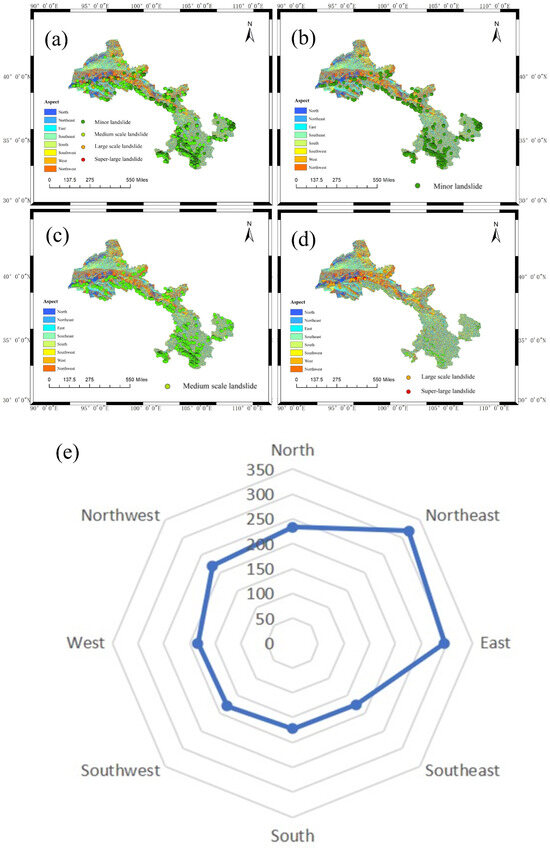 Figure 14a presents the aspect information for Gansu Province while Figure 14e shows the number of landslides across eight different aspects. In Figure 14b, we display the distribution of micro-landslides in Gansu Province. Figure 14c illustrates the distribution of medium-sized landslides. Finally, Figure 14d shows the spatial distribution of large and very large landslides. The results indicate that the numbers of landslides identified by the model were significantly higher in the northeastern and eastern directions compared to the other six directions. This was primarily due to the ascending orbit data having an azimuth angle of approximately −15°, making them more sensitive to deformations in the northeastern and eastern directions. In contrast, detecting deformations in the flight direction was more challenging. Figure 14a shows that the slopes facing the north are mainly distributed in the northern part of Gansu Province, where a large number of landslides were not detected.