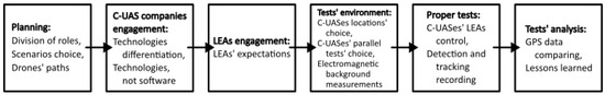 Before commencement, it was necessary to plan the subsequent days of testing, including all the functions to be distributed among consortium partners. The selection of test scenarios in each country and its respective infrastructure was also crucial. At this stage, we needed to plan the drone flight paths, decide whether they would be operated by pilots or fly autonomously, determine the flight altitudes and speeds, etc. Subsequently, we could send invitations to the selected companies producing C-UAS solutions. We aimed to invite companies to test the widest variety of C-UAS technologies and their diverse combinations rather than focusing on a single ready-made solution. Additionally, we tested technologies, not integrating software; hence, companies that did not produce their own hardware solutions were not considered as standalone systems (but as components of larger consortia). The next step involved conducting surveys among end users (LEAs) about their expectations regarding the test procedures. Once a sufficient number of C-UASs had been submitted, we could proceed with deploying the systems near the test centre infrastructure. One of the major challenges was deciding how to test several different systems simultaneously. Sequential testing—one after another—would not guarantee identical weather conditions, drone flights, or test durations for all systems, leading to non-reproducible tests. We opted for the parallel testing of C-UASs. Therefore, we needed to ensure that the systems did not interfere with each other, which is why we conducted all-day electromagnetic background measurements at the test site. Each C-UAS was monitored by a LEA representative who recorded the moments of detection and the tracking of drones by the system. All detections and traces were additionally recorded by each company for later analysis. After the tests, the results were discussed, and then the actual drone flight paths were mapped and compared to what the C-UASs had shown. The actual drone paths were known thanks to GPS trackers attached to each launched drone. The above research framework is presented in Figure 1.