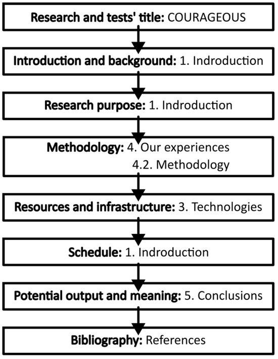 The authors conducted tests of C-UASs in accordance with the structural description of basic research. The basic research framework used in this article has a slightly modified order, as its core is the discussion of C-UAS technologies and the testing methodologies implemented within the COURAGEOUS project. To enhance the readability of the article, Figure 2 presents the structural framework of the basic research, indicating where each stage appears in this paper.