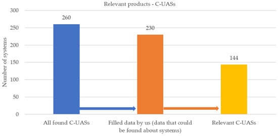 A summary of the identified C-UAS solutions is shown in Figure 3. In total, 260 systems were found, but the data of 30 systems were not filled. Of the relevant C-UAS solutions from 230 systems with data that were filled, 86 systems were not relevant (the “not relevant systems” are those that were only software for DTI systems of other manufacturers, devices disrupting the transmission between the pilot and the UAS (i.e., jammers), or systems designed for neutralising UASs). The final number of systems relevant for the COURAGEOUS project is, therefore, 144, as shown in Figure 3.