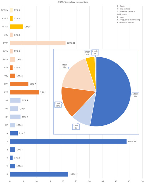 Combinations of technologies used in C-UAS solutions. The data label contains the percentage share of the given combination of technologies in relation to the C-UASs present in the base and the number of them.