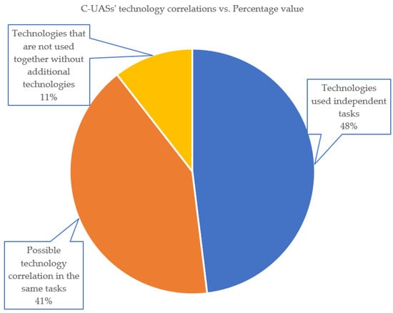 C-UAS solutions very often enable decisions to be made about detection, identification, or tracking using only one technology for this purpose; however, additional technologies performing the same task can improve the efficiency of this process. The condition is that the results of individual classifications are similar, as a significantly weaker classifier may adversely affect the final results of the task. It is possible that C-UAS manufacturers use additional technologies to limit the set of results initially and then decide by using another technology or by applying the weights of the results obtained from individual technologies. Unfortunately, the manufacturers do not describe the details of this process. Figure 7 shows the likely possible correlations between the pairs of technologies used by C-UAS producers.