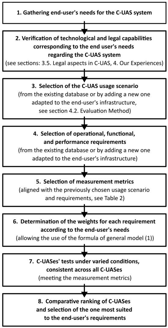 In summary, the proposed methods for assessing the effectiveness of modern counter unmanned aircraft systems, developed within the COURAGEOUS project, are presented in the form of a simplified algorithm in Figure 9.