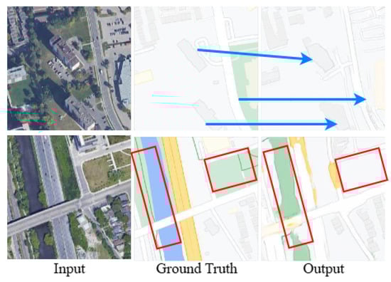 The application of deep learning has demonstrated considerable potential in the field of remote sensing image processing, such as object extraction, classification [2,3], automatic detection [4], road and building extraction [5,6,7] and semantic segmentation [8]. The fast development of deep learning generative modes in the image synthesis field provides a new alternative to online map generation. In the context of the generative framework, input images and target results are conceptualized as two distinct domains. The generative model attempts to use Generative Adversarial Networks (GANs) [9] as a domain mapping method to conduct translation between domains. The current GAN-based image translation model is originally from Conditional GANs (CGANs) [10], such as Pix2Pix [11] and CycleGAN [12]. Ganguli et al. present an innovative method for the translation of RS images-to-online maps [13]. However, the CycleGAN only proposes a cyclic consistency loss to control generation, which makes the results suffer from inaccurate details. Moreover, some other methods [14,15,16] perform more exploration for remote sensing image-to-map translation (RSMT). Nonetheless, these applications of general GANs to the domain of map translation exhibit several inherent limitations [17]. Figure 1 illustrates the unresolved problems in the existing works. To address these problems, Song et al. propose more loss functions to enhance model performance. For example, a geometric consistency is implemented in MapGen-GAN [18] to increase the accuracy of the translated maps compared with CycleGAN, which implies that, for specific tasks, some designed loss functions are vitally important. While previous works based on GANs achieved outstanding performance on most online map generation tasks, they still fall short in terms of capturing more diversity [19], particularly in terms of mode coverage, which may result in blurred boundaries and semantic distortion for the RSMT. Therefore, it is evident that the construction of a new model is required in order to address the challenge of more diversity elements in remote sensing images.
