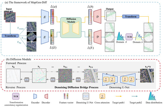 Overall architecture of our proposed model MapGen-Diff. Part (a) illustrates the pipeline of MapGen-Diff. There are two diffusion processes with shared weights. First, we use an encoder E to map the remote sensing images from pixel space into feature space. Second, through the transformation function =, we train the network separately on original and transformed data. Finally, we adopt TCR loss to retain the consistency between original data and transformed data. Part (b) shows the detailed diffusion process. We utilize the data distribution from Domain A and Domain B as the endpoints of the diffusion process. While sampling in the reverse process, we utilize a U-Net network in the denoising process to control the generation in the feature space.