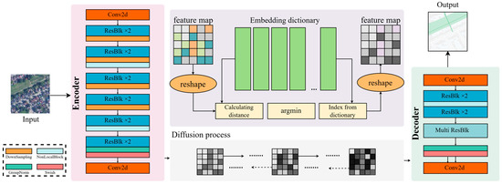 The traditional diffusion model is limited by its large cost of computation sources. Thus, we draw on the previous work, proposing the VQGAN to achieve Perceptual Image Compression [50]. To compress the parameters of the creative models, VQGAN is designed to keep good perceptual quality and an increased compression rate via a discriminator and perceptual loss. Therefore, the pretrained VQGAN is employed in the latent diffusion model for natural image generation [22]. For RSMT, the remote sensing images have more diversity elements in perception. It is believed that mapping the raw images into latent space with VQGAN can improve the model’s performance. The detailed architecture is shown in Figure 3.