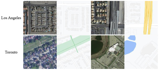 In order to verify the effectiveness of the proposed model, we conducted experiments on the Los Angeles datasets and Toronto datasets [27], which comprise both remote sensing images and the corresponding maps sourced from Google Maps. The images are from the Digital Orthophoto Map and are in visible wavelengths, comprising buildings, roads, waterway and vegetation. To ensure the feasibility of the experiment, the data were cleaned to remove the adverse impacts caused by illumination and weather.