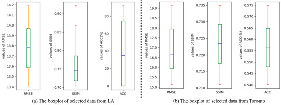 The valuation metric Pixel Accuracy (ACC) is used to calculate the pixels level precision of a generated image. The original RGB value is described as , and the predicted RGB value of the translated maps is ; if the max is set as 5 according to [58], , it is considered that the translator is accurate.