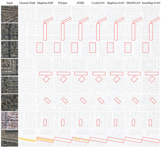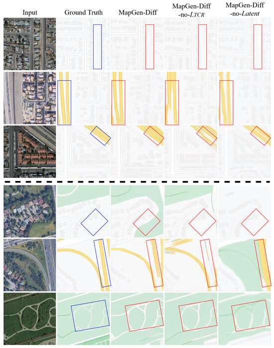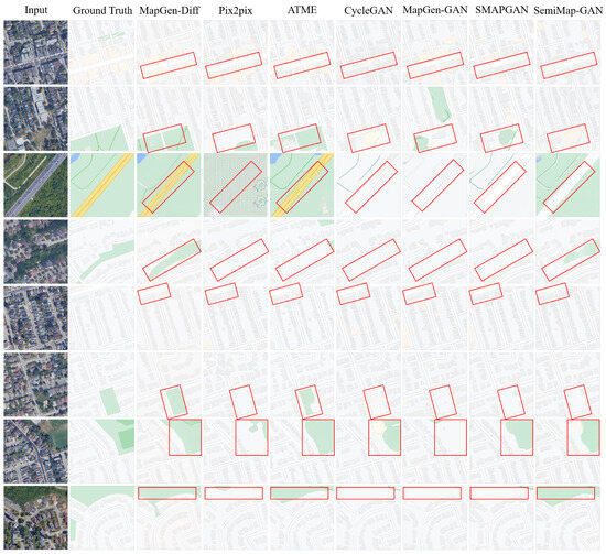 Next, we compare the test time taken to translate remote sensing images into online maps with real-world Toronto datasets. In Table 6, it is shown that it takes about 20 min to generate maps from a seventy-square-kilometer urban area. According to [60], it takes about one day to make a map of 0.5 square kilometers and a 1:2000 scale manually. Therefore, compared with traditional methods, the translation time of MapGen-Diff is acceptable. While the computation cost is relatively large, we acquire higher-quality online maps instead.