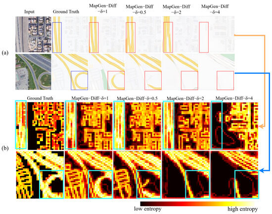 Qualitative results involving varying the maximum variance . Part (a) demonstrates the visualization of the generated map; part (b) represents the entropy image of the translated maps based on the different values of .