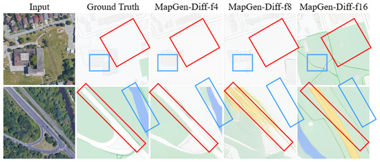 When we compare the MapGen-Diff with different downsampling factors , from Figure 10, there are some interesting results within different f values. In the red rectangle, the model with higher values seems to generate maps which are more in line with subjective judgments. However, there are more mistakes represented in the blue rectangles.