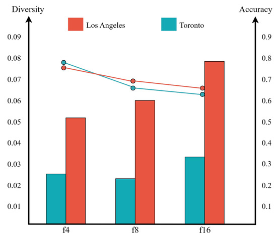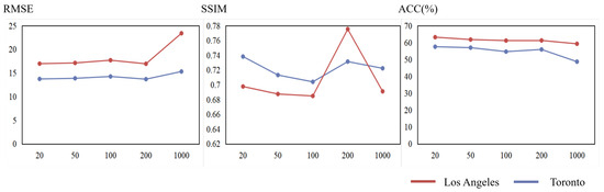 Therefore, we quantitatively analyze the diversity and accuracy of generated maps under different sampling factors illustrated by bar and line charts. In Figure 11, the bar chart represents diversity, which uses the average discrepancy between images. With higher values of f, the diversity increases ( in LA, in Toronto). The line chart indicates the accuracy for which we employ the SSIM as the evaluation metric. The accuracy of generated maps declines, about (), as the f increasing. The analysis yields conclusions consistent with the aforementioned qualitative results. The higher downsampling factor leads to more abstract generation.